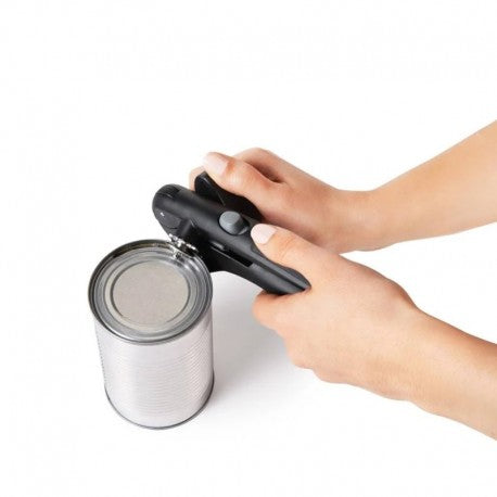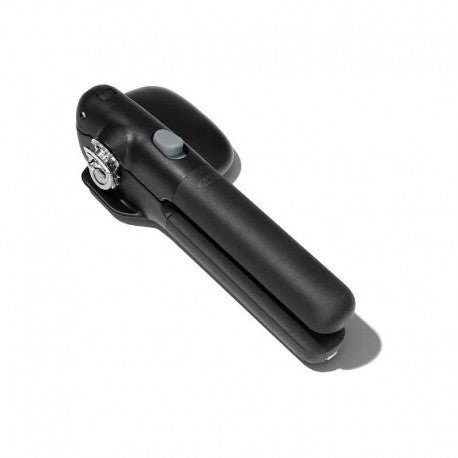 Los cierres de este abrelatas de Oxo se activan y sostienen la lata con firmeza.