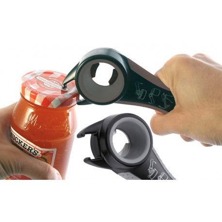 Abridor multifunción Aperto 5 en 1 de Gefu. El abridor multifunción, es un 5 en 1 y se ha diseñado para quitar el tapón (chapa) de botellas de cristal y el tapón de rosca de botellas, también abre latas de conserva con anilla, latas de bebida y tarros de cristal con tapón de rosca.