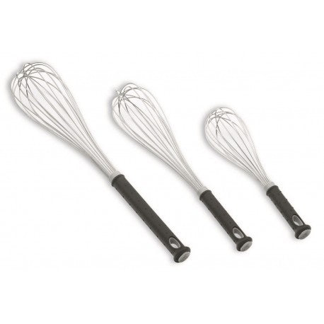 Batidor con varillas de acero inoxidable y mango de fibra de vidrio.