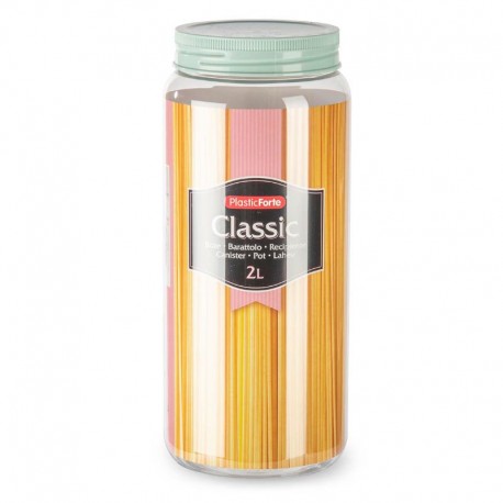 Bote redondo de plástico de 2 litros con tapa a rosca. Organiza tu cocina con los botes herméticos para alimentos. Este bote por su altura es ideal para almacenar pasta, sobre todo espaguetis. Disponible con tapa de color verde claro, rosa claro y marrón claro. Es 100% hermético. Fabricado en plástico libre de BPA. Fabricado en España.