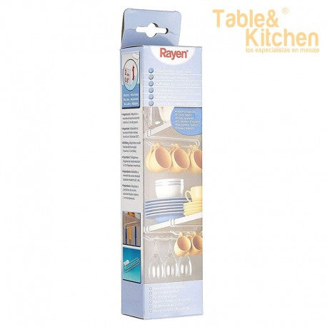 El Colgador para Copas y Tazas de Rayen es un producto versátil que se puede utilizar para colgar fregonas, mopas, escobas y tazas en la cocina o comedor sin necesidad de instalación.