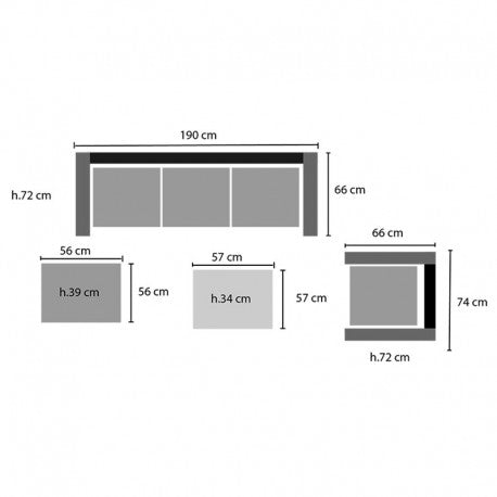 Este conjunto está fabricado en España, en ratán sintético plano de gran resistencia y adecuado para el uso diario en exteriores, resiste al agua y es fácil de limpiar. Es moderno y de gran comodidad para colocarlo en tu lugar favorito y poder disfrutar del tiempo libre. Este conjunto está compuesto por un sofá de 3 plazas de 190x66xh.72 cm, un sillón de 74x66xh.72 cm, una mesa de 57x57xh.34 cm y un puf de 56x56xh.39 cm. Los cojines están fabricados en poliéster, material idóneo para exteriores. El montaje es sencillo y viene presentado en caja.