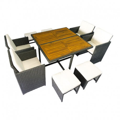 Este conjunto está fabricado con una estructura metálica y en ratán sintético plano de gran resistencia y adecuado para el uso diario en exteriores. Es moderno y de gran comodidad para colocarlo en tu lugar favorito y poder disfrutar del tiempo libre. Además tiene una forma cúbica, una vez lo hayas utilizado, puedes guardar todos los sillones debajo de la mesa, bajando el respaldo optimizando el sitio. Este conjunto está compuesto por 4 sillones individuales de 53x53xh.69/89 cm, 4 taburetes de 40x40xh.35 cm y una mesa con la superficie de madera de acacia 109x109xh.75 cm. Los cojines están fabricados en poliéster, material idóneo para exteriores. El montaje es sencillo y viene presentado en caja.