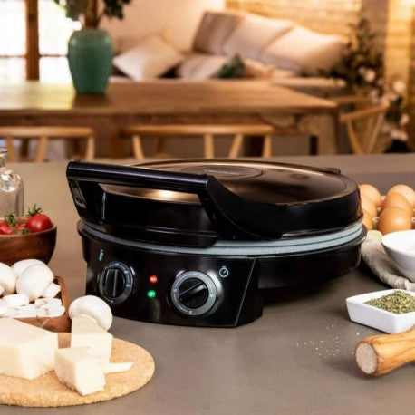 Horno grill eléctrico para pizza de 1800W, con temporizador, temperatura regulable y apertura de 180º, equipado con dos placas antiadherentes con revestimiento RockStone.