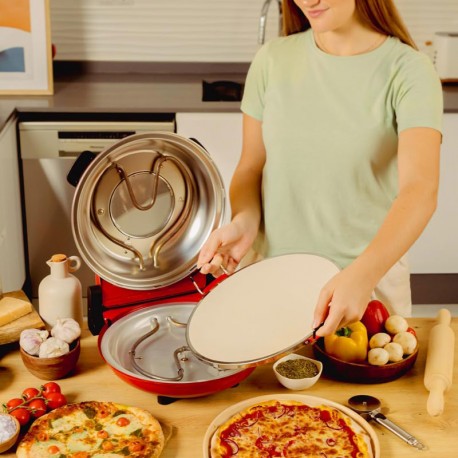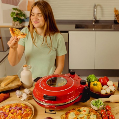 El Pizza&Co Mamma Mia Vista es el horno eléctrico ideal para preparar pizzas auténticas en casa con resultados profesionales. Con 1200 W de potencia y una temperatura máxima de 420 ºC, cocina tus recetas de forma rápida, uniforme y sin esperas. Su piedra cerámica, el control de temperatura y la ventana de visualización te permiten lograr pizzas crujientes, bien hechas y con el punto perfecto.