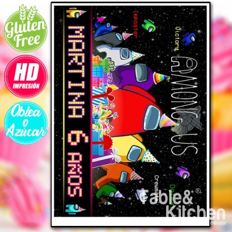 Impresión comestible para decoración de tartas con diseño de Among Us. Diseñado por Table&Kitchen.