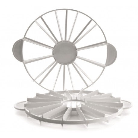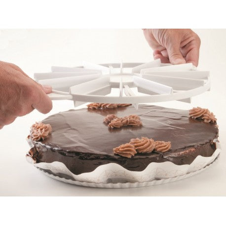 Marcador para tartas que permite dividirlas fácilmente en 10 o 12 porciones idénticas. Fabricado en plástico de color blanco y con un diámetro de 26 cm.
