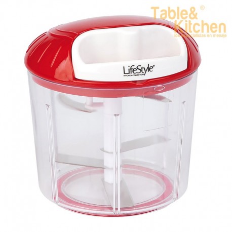 Picadora y batidora manual con capacidad de 1 litro que utiliza cuchillas para cortar y picar verduras, frutos secos, tomates, cebolla, etc. Permite ajustar la fineza del picado según las pasadas, logrando picado fino, medio o grueso.