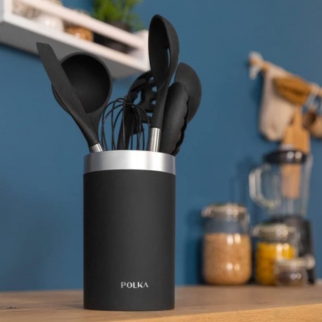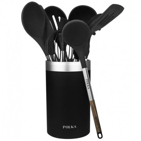 El set de utensilios de cocina Polka Excellence Force de Cecotec es la solución completa para equipar tu cocina con estilo y funcionalidad. Este práctico set incluye 9 utensilios en color negro con mangos de diseño elegante que imitan la madera, brindando un toque moderno y sofisticado a tu espacio. Fabricados con materiales de alta calidad como silicona, nylon y PP, estos utensilios son resistentes al calor (hasta 220ºC), seguros para tus alimentos y totalmente libres de BPA y otros tóxicos. Además, cuentan con un soporte compacto y funcional para mantenerlos organizados y siempre a mano.