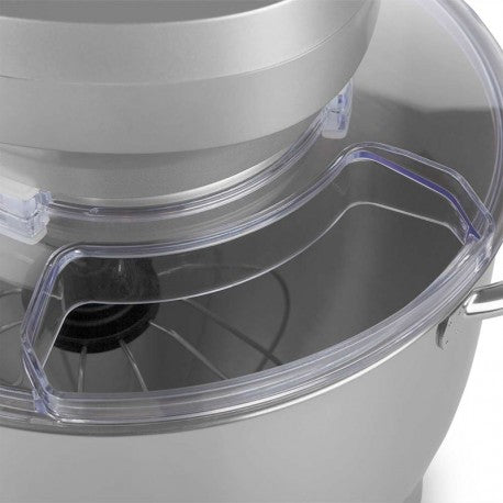 Incluye bol de acero inoxidable de 7 L con dos prácticas asas. Esta amasadora cuenta con una tapa de protección contra salpicaduras con un orificio de llenado que posibilita incluir ingredientes sin necesidad de parar el funcionamiento del aparato.