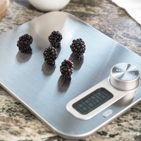 Báscula de cocina sin pilas con acabado en acero inoxidable de alta calidad. Ofrece una solución ecológica con su función Eco Power que genera energía eléctrica girando el botón, eliminando la necesidad de cambiar pilas.