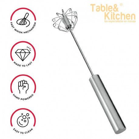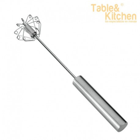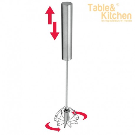 El Batidor automático de acero inoxidable de Metaltex de 35 cm es un utensilio de cocina con un sistema de rotación que funciona presionando el mango de manera continua. Está diseñado para mezclar ingredientes de manera eficiente.