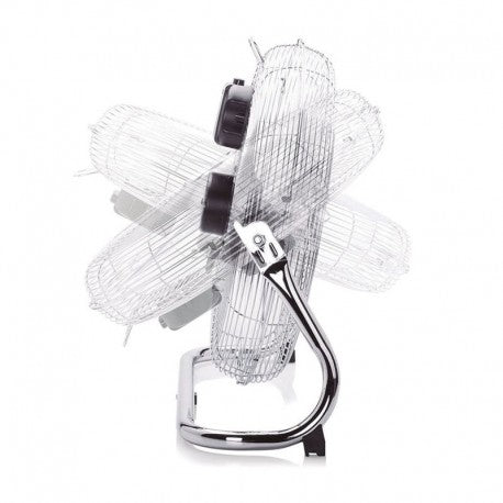 Este ventilador tiene la estructura metálica, dispone de un cabezal inclinable 130º, una base muy estable y antideslizante. Su motor de 80 W puede refrescar una habitación entera o una oficina. La hélice está fabricada en plástico. Tiene 3 velocidades. En la parte trasera tiene una práctica asa para que lo puedas desplazar con facilidad. Viene presentado en caja y tiene 3 años de garantía.