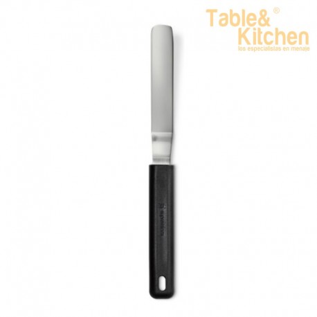 Mini espátula acodada de acabado plano ideal para emplatar. Sus medidas son 9x1,8 cm.