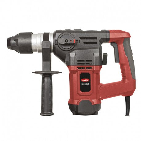 Martillo electroneumático RATIO MR1500ND con anclaje SDS-Plus. Ofrece tres funciones: taladro, martillo y cincel. Equipado con empuñadura bimaterial para un agarre cómodo. Viene en un maletín de transporte que incluye empuñadura auxiliar, tope de profundidad, 3 brocas SDS-Plus, 1 puntero, 1 cincel SDS-Plus, bote de grasa y 1 juego de escobillas.