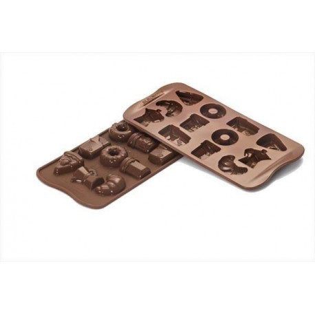 Molde fabricado en silicona Platinum 100% para hacer bombones con forma de cuña de tarta, cafetera, croissant, donut, mantequilla y mermelada.