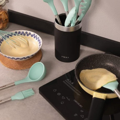 Juego de 9 piezas de utensilios de silicona con soporte de la marca Cecotec.
