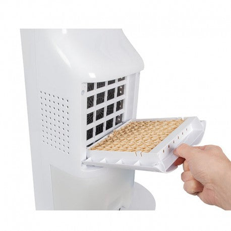 El climatizador HABITEX dispone de un consumo eléctrico reducido de 65W. Tiene unas dimensiones de 26x26xh.109 cm y un caudal de aire de 5 m3/min. Cuenta con temporizador de 12h y un depósito de 4 litros. Además dispone de oscilación, 3 velocidades y 3 modos: normal, brisa y noche. Podrás manejar el climatizador desde cualquier lugar gracias a su mando a distancia (1 pila CR2032 incluida).
